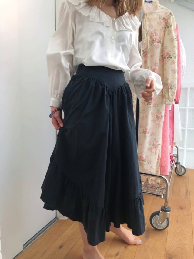 80年代のブラックフリルガウチョパンツです。 古着ならではのデザインとシルエットがとっても可愛いです☺ 程よいボリューム感で薄手のコットンなので重さもなくかさばらないと思います。 ウエストの切り替え部分のデザインや裾が斜めになっているデザインが全体をすっきりと見せてくれるのでバランス感が良いです。裾の大きめのフリルにきゅんとします。 パンツの両サイドの上から下までボタンになっていて開閉可能で、短めのベルトが付いているので、 後ろで結んだり、前で結んでも可愛いです☺ シンプルなTシャツにも相性抜群です♡ - size - 総丈: 約78cm(内側)、約67cm(外側) ウエスト幅: 約31cm ※ 着用者: 160cm - color - black - material - コットン 古着のため全体的な色褪せと使用感がございます。 古着の特性をご理解頂いた上ご購入下さい。 ※ ATTENTION ※ • 採寸は平置き状態で手作業で行っております。1~2cmの誤差が生じる場合がございますので予めご了承下さい。 • お品物に多少のダメージ(シミ・糸のほつれ・多少の汚れ・小さな穴・色褪せなど)が有ることがございます。できるだけ記載しておりますが、正確に全てを記載することが難しいためあくまでもUSED商品であること、古いものの良さとしてご理解のうえご購入をお願い致します。 • ご覧の端末や画面によって、実際の商品と色味や状態が異なる場合がございますので予めご了承下さい。