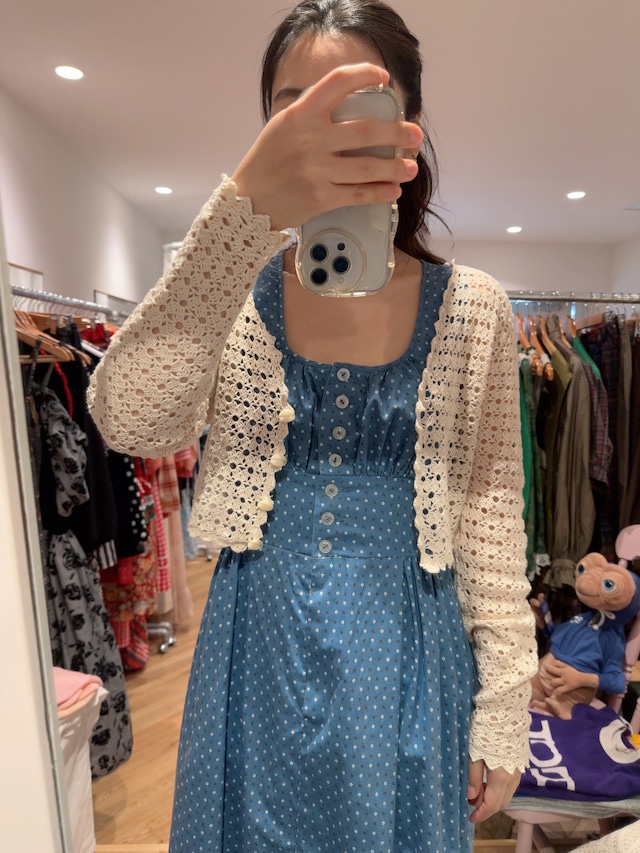 鍵編みニットのショート丈カーディガン。 襟ぐり、裾、袖口がギザギザのデザイン。 - size - 着丈: 約38cm 肩幅: 約42cm 袖丈: 約52cm 身幅: 約39cm model: 158cm - color - cream white - material - 記載なし ダメージ箇所はなく状態も良いです。 古着の特性をご理解頂いた上ご購入下さい。 ※ ATTENTION ※ • 採寸は平置き状態で手作業で行っております。1~2cmの誤差が生じる場合がございますので予めご了承下さい。 • お品物に多少のダメージ(シミ・糸のほつれ・多少の汚れ・小さな穴・色褪せなど)が有ることがございます。できるだけ記載しておりますが、正確に全てを記載することが難しいためあくまでもUSED商品であること、古いものの良さとしてご理解のうえご購入をお願い致します。 • ご覧の端末や画面によって、実際の商品と色味や状態が異なる場合がございますので予めご了承下さい。
