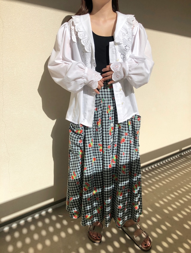 お花モチーフの総レースのシルエットが綺麗なフリルブラウスです。 - size - 着丈: 約54cm 肩幅: 約38cm 身幅: 約41.5cm 袖丈: 約58cm ※ model: 158cm - color - cream white ホワイトとクリーム色の中間のような優しい色味です。 - material - ポリアミド *若干ですが、伸縮性がございます。 目立つダメージはなく、状態も良いです。 古着の特性をご理解頂いた上ご購入下さい。 ※ ATTENTION ※ • 採寸は平置き状態で手作業で行っております。1~2cmの誤差が生じる場合がございますので予めご了承下さい。 • お品物に多少のダメージ(シミ・糸のほつれ・多少の汚れ・小さな穴・色褪せなど)が有ることがございます。できるだけ記載しておりますが、正確に全てを記載することが難しいためあくまでもUSED商品であること、古いものの良さとしてご理解のうえご購入をお願い致します。 • ご覧の端末や画面によって、実際の商品と色味や状態が異なる場合がございますので予めご了承下さい。