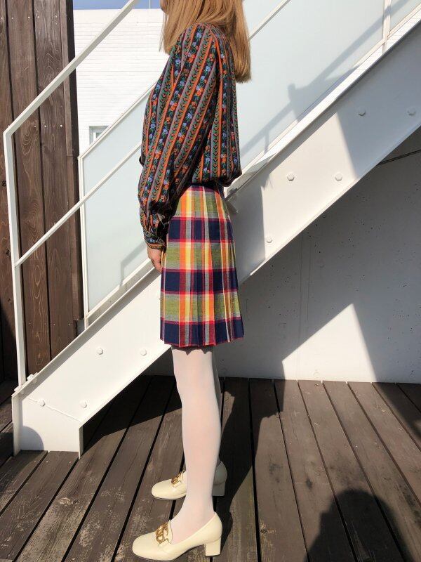 チェックのプリーツはたくさんありますが、このスカートはイエロー、ネイビー、レッドの色味のバランスとチェックのサイズ感がたまらなく可愛いです☺短すぎない丈感やシワになりにくい素材感も◎。