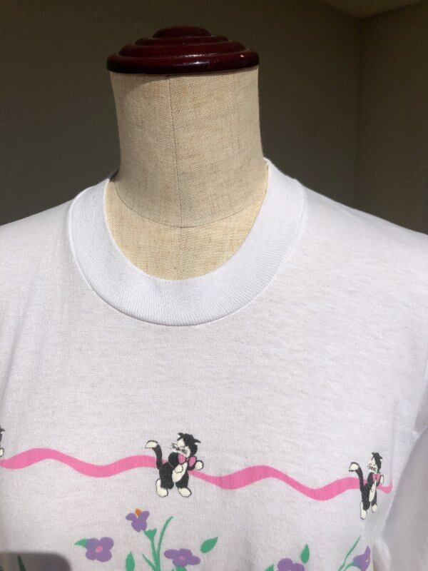 リボンにまとわりついている猫が愛らしいこのTシャツはよく見ると猫のプリントだけ立体になっています♡
