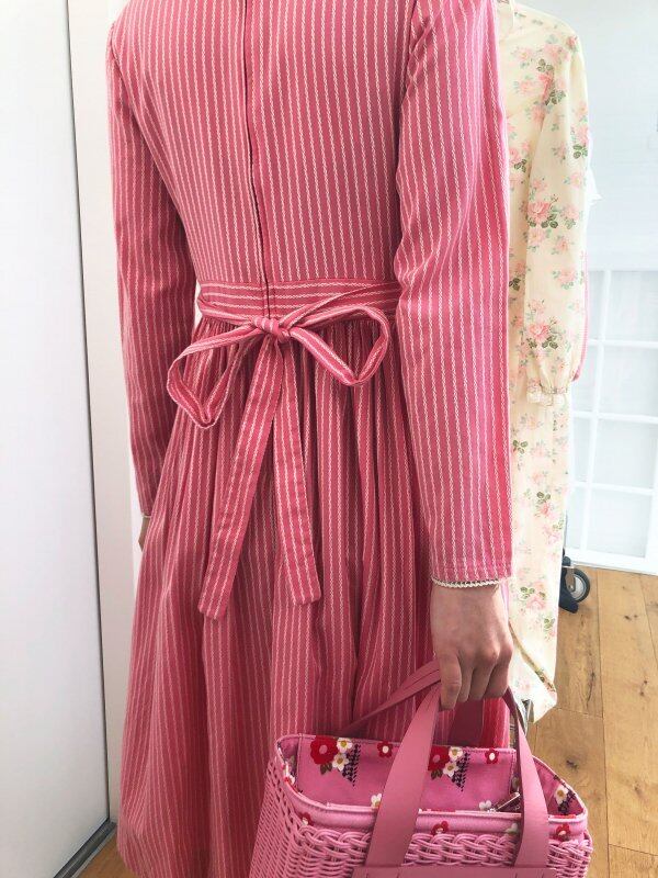 一見、キッズドレスのようなデザインですが、よく見ると襟、袖、前たて部分の繊細なレースが施されていたり、ストライプの柄も繊細なモチーフになっています。