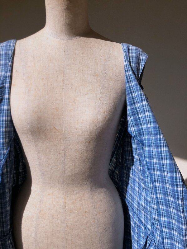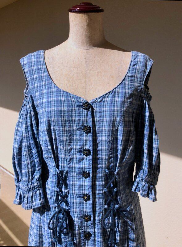 一見、ブルーとホワイトのシンプルなチェック柄のドレスですが、微妙に違う色味のブルーが何色も配置されていたり、素材感も少しワッフルっぽかったり、お花モチーフのボタンだったりシンプルな雰囲気な中にも可愛さが散りばめられています♡