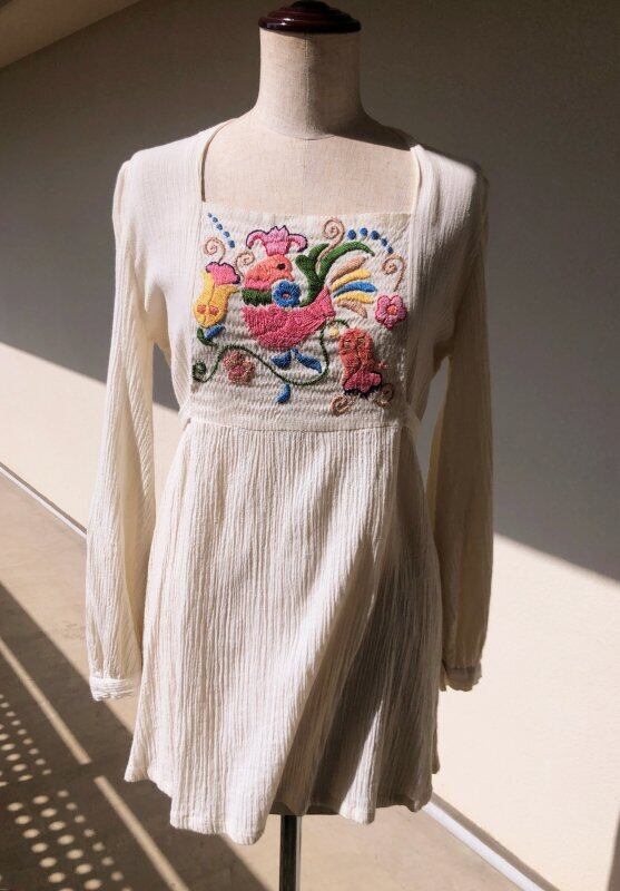 鳥とお花の刺繍がハッピーなオフホワイトチュニックです。