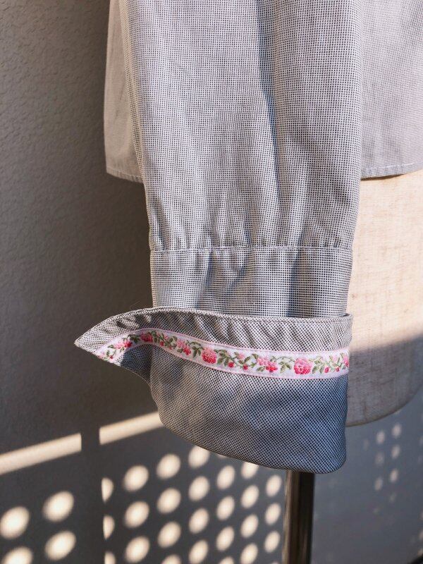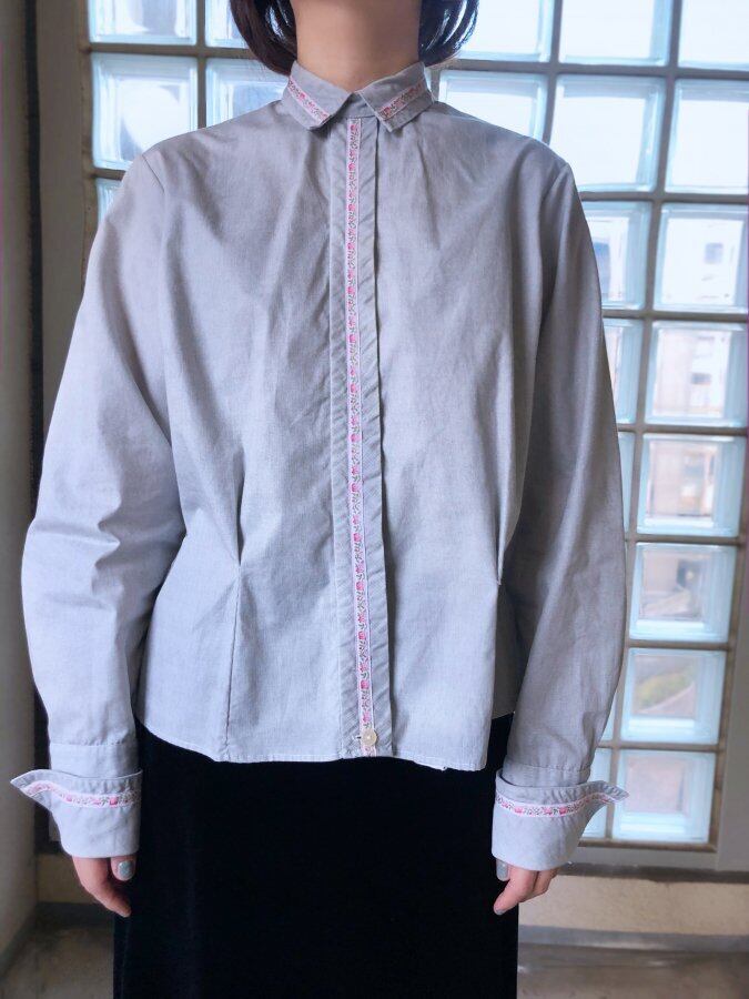 シンプルなアイテムですが、袖の折り返し部分やフライフロント部分のお花の刺繍のパイピングなど隅々までデザインが凝っていて可愛いです☺