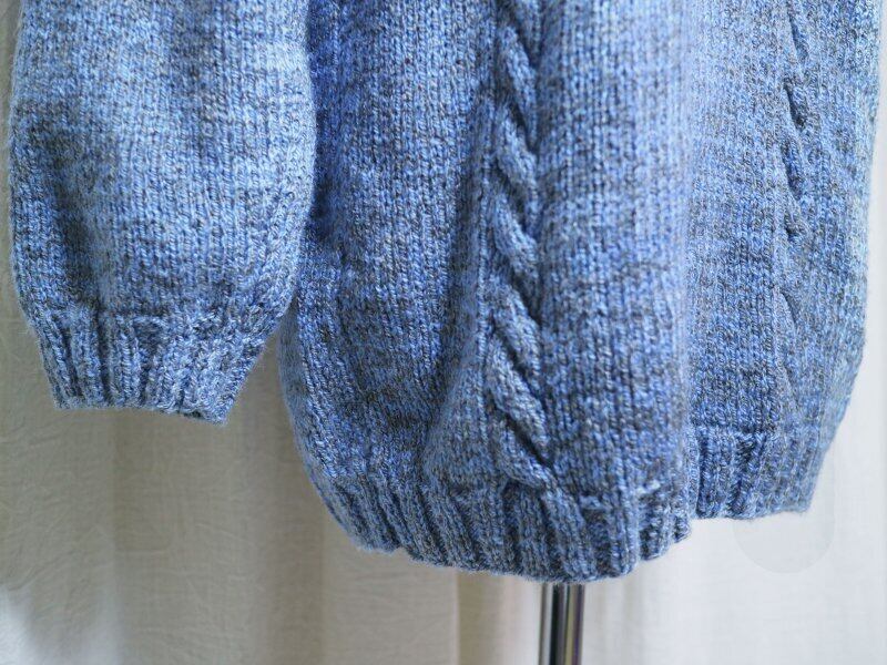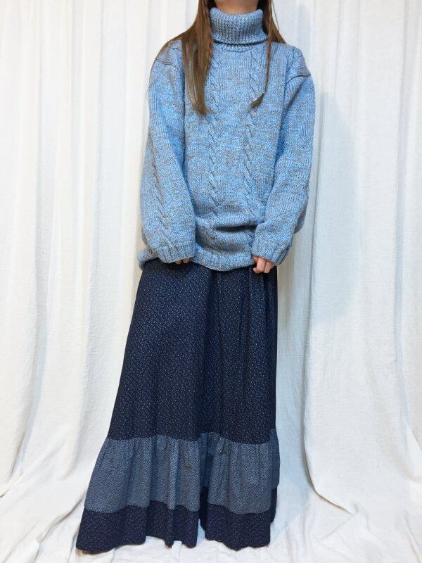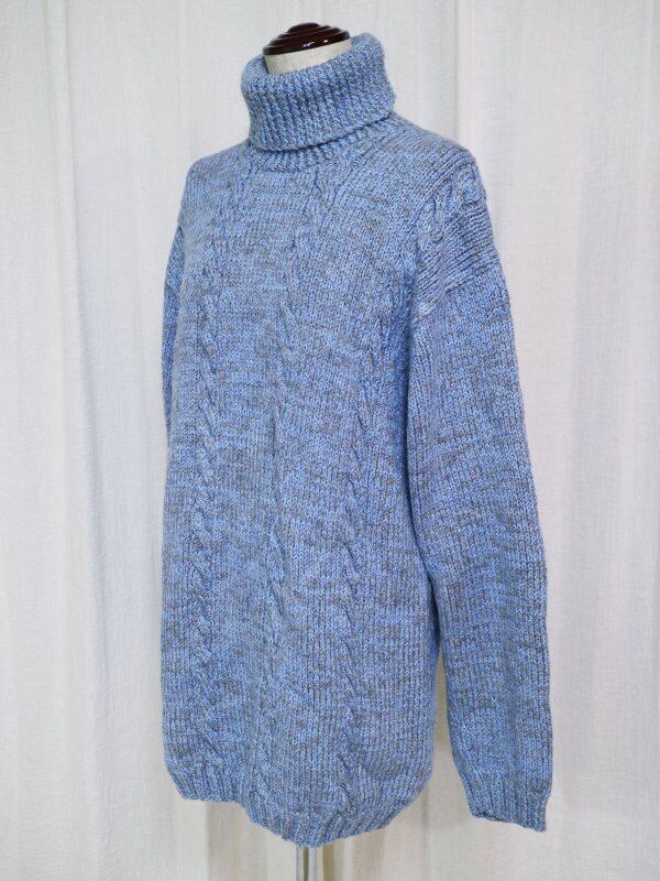 スカイブルーとグレーのケーブル編みのタートルニットです。