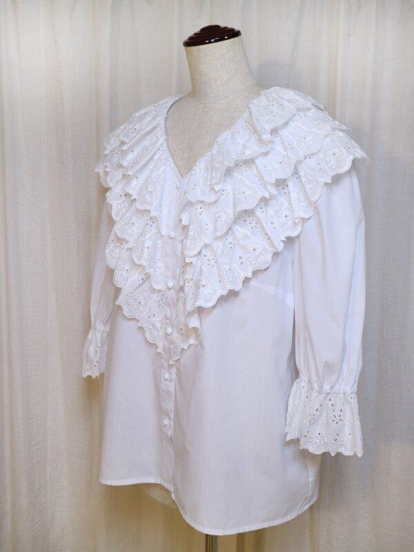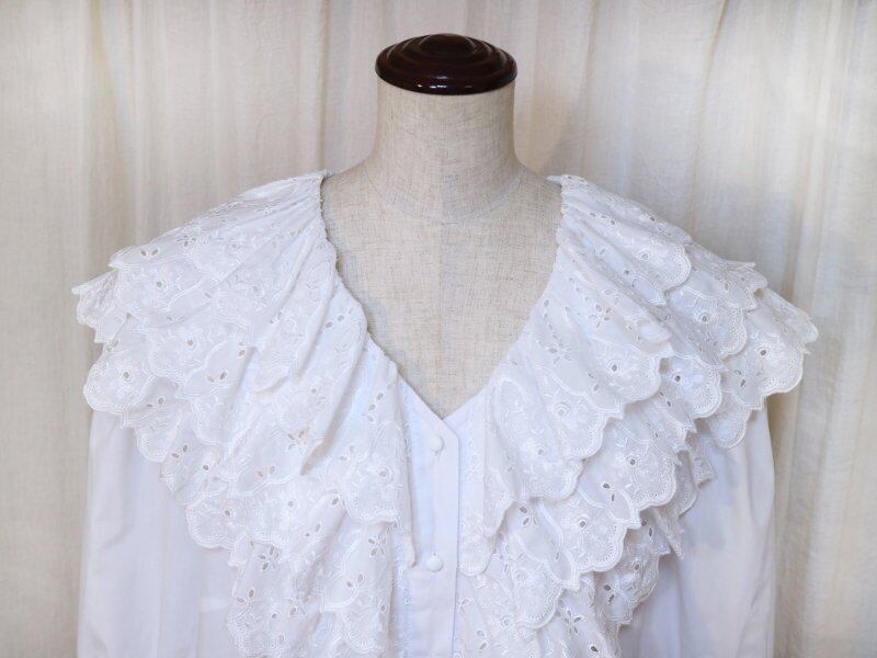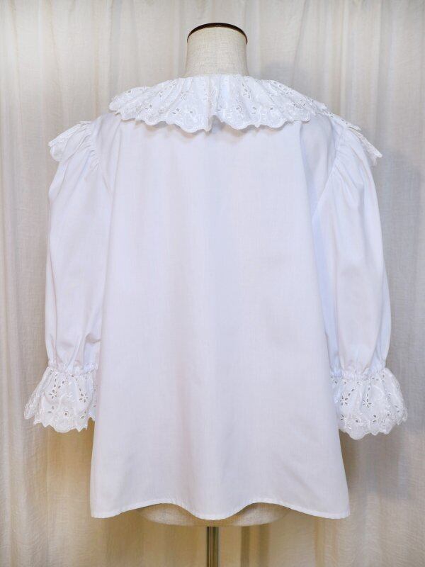 レースの襟が特徴的なホワイトのコットンブラウスです。