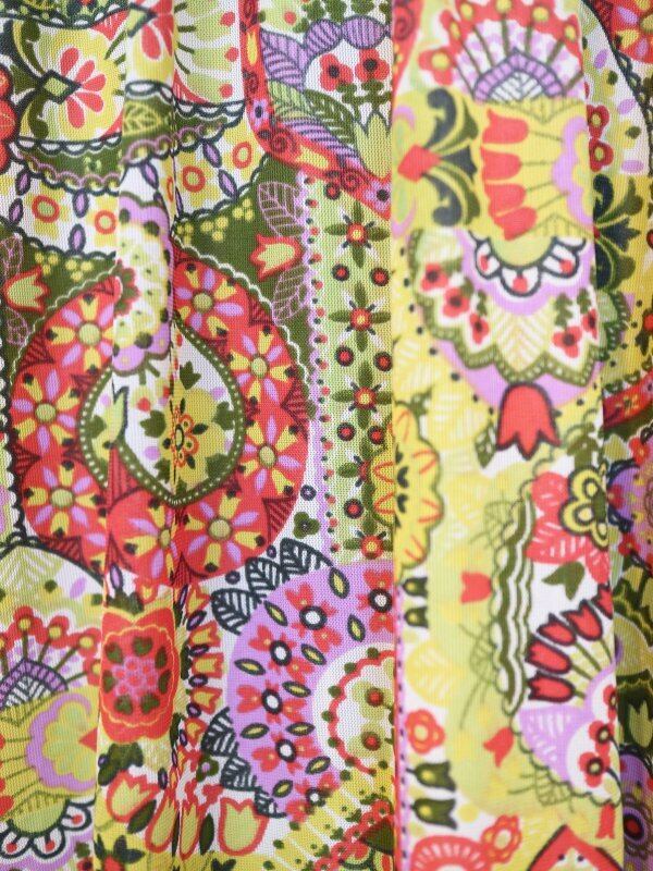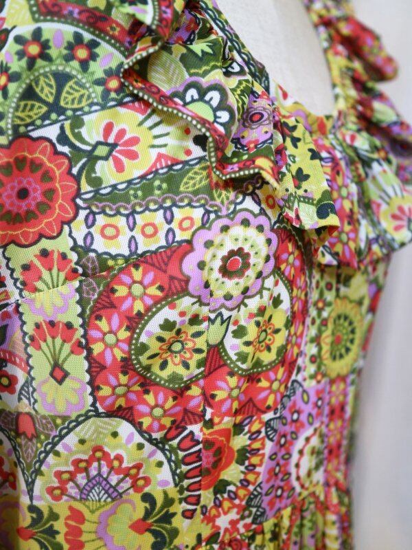柄、色味、胸下の切り替え、シルエットや襟元と裾のフリルが70年代の空気満載です☺