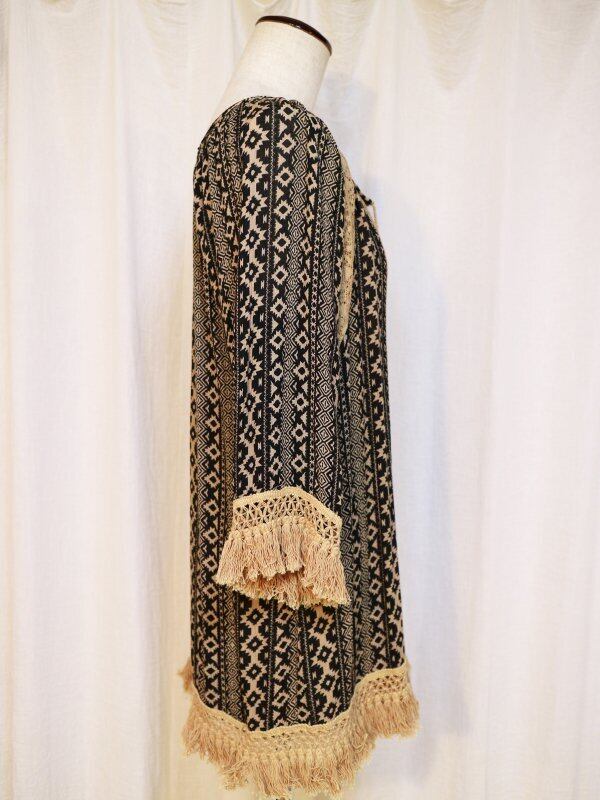 落ち着いた色味ですが、袖と裾に大振りのフリンジにインパクトがあって素敵です☺