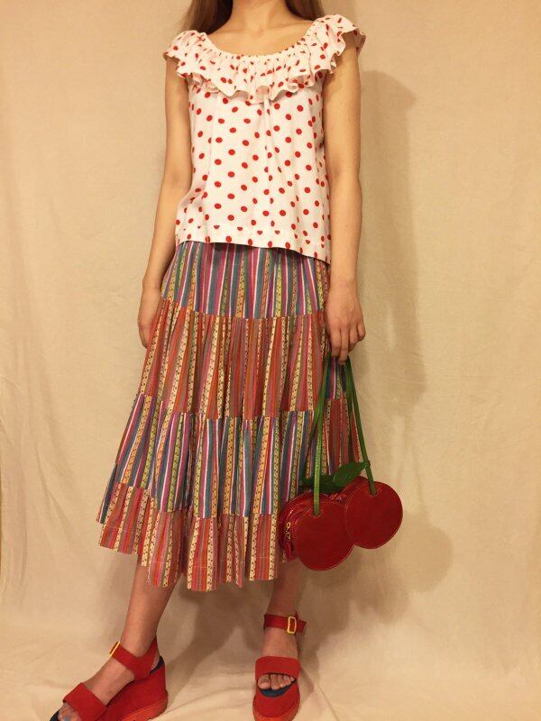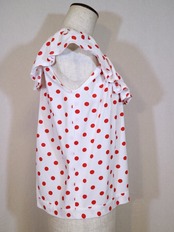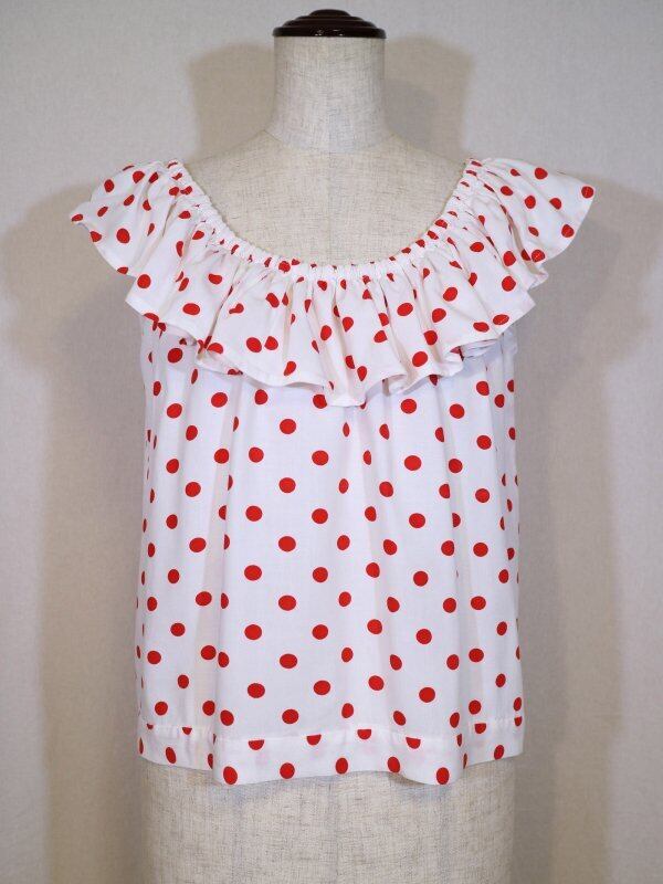 白地に赤のドットが愛らしいフリルトップスです。