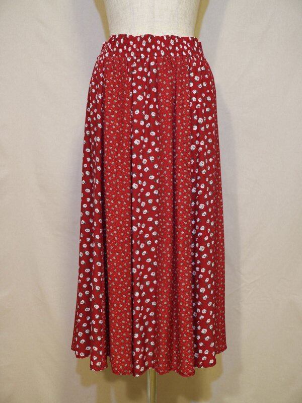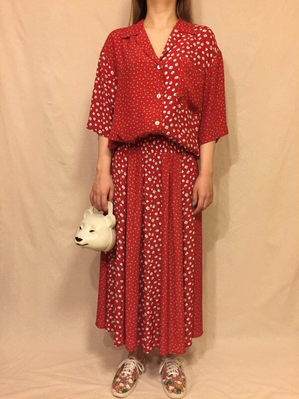 フラワープリントのオープンカラーとギャザースカートのセットアップです。