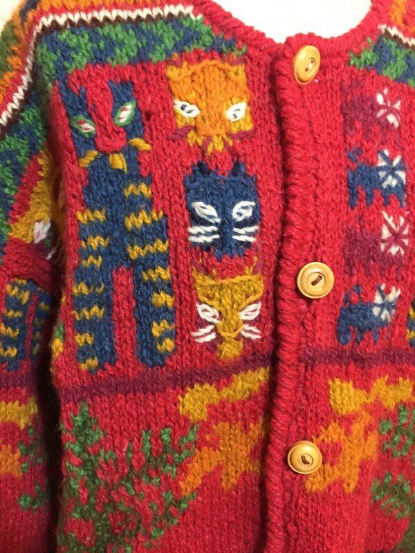 大きめシルエットの猫や自然が編みこまれたカーディガンです。
