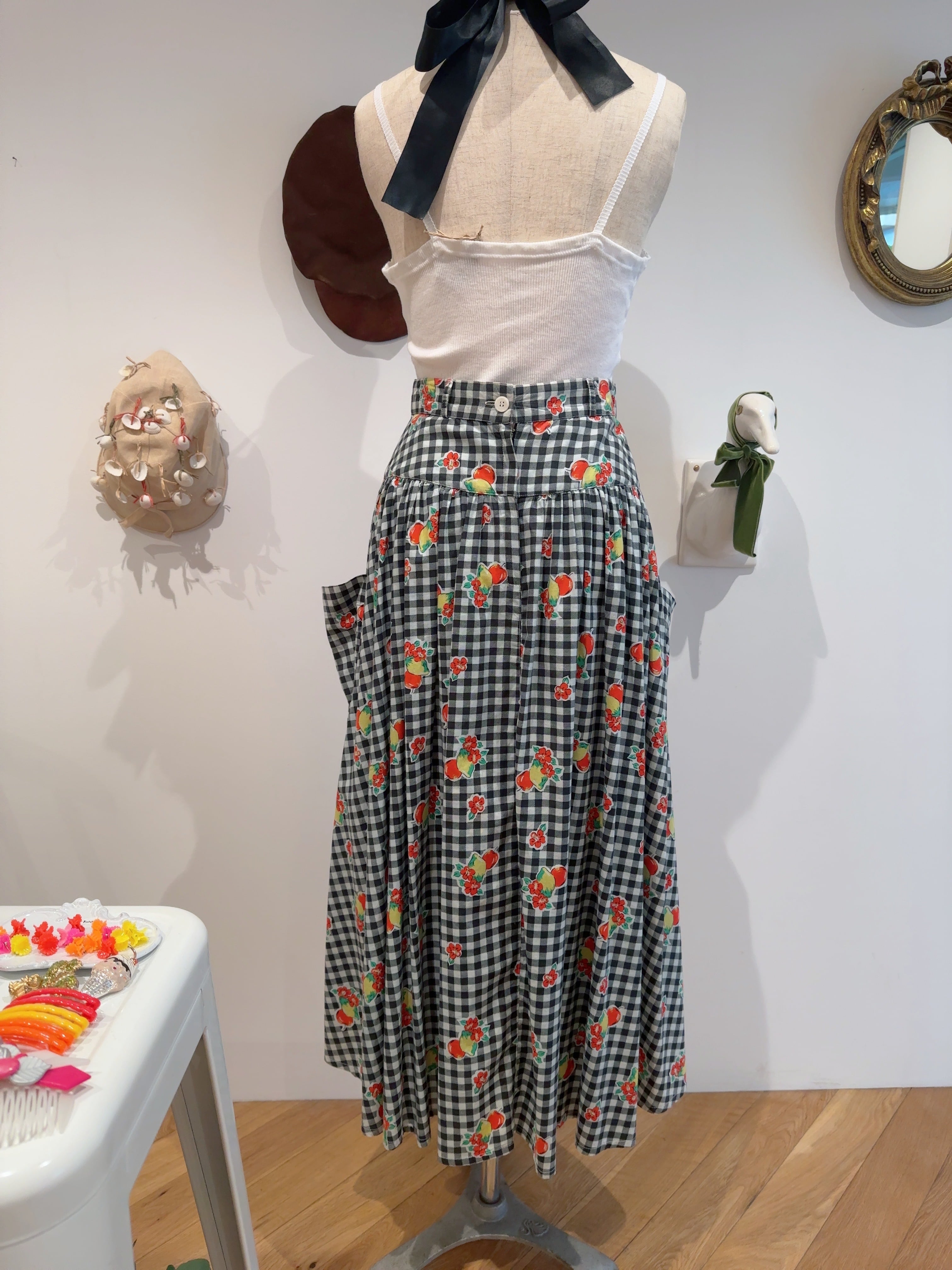 フルーツとお花モチーフ柄のギンガムチェックスカートです。