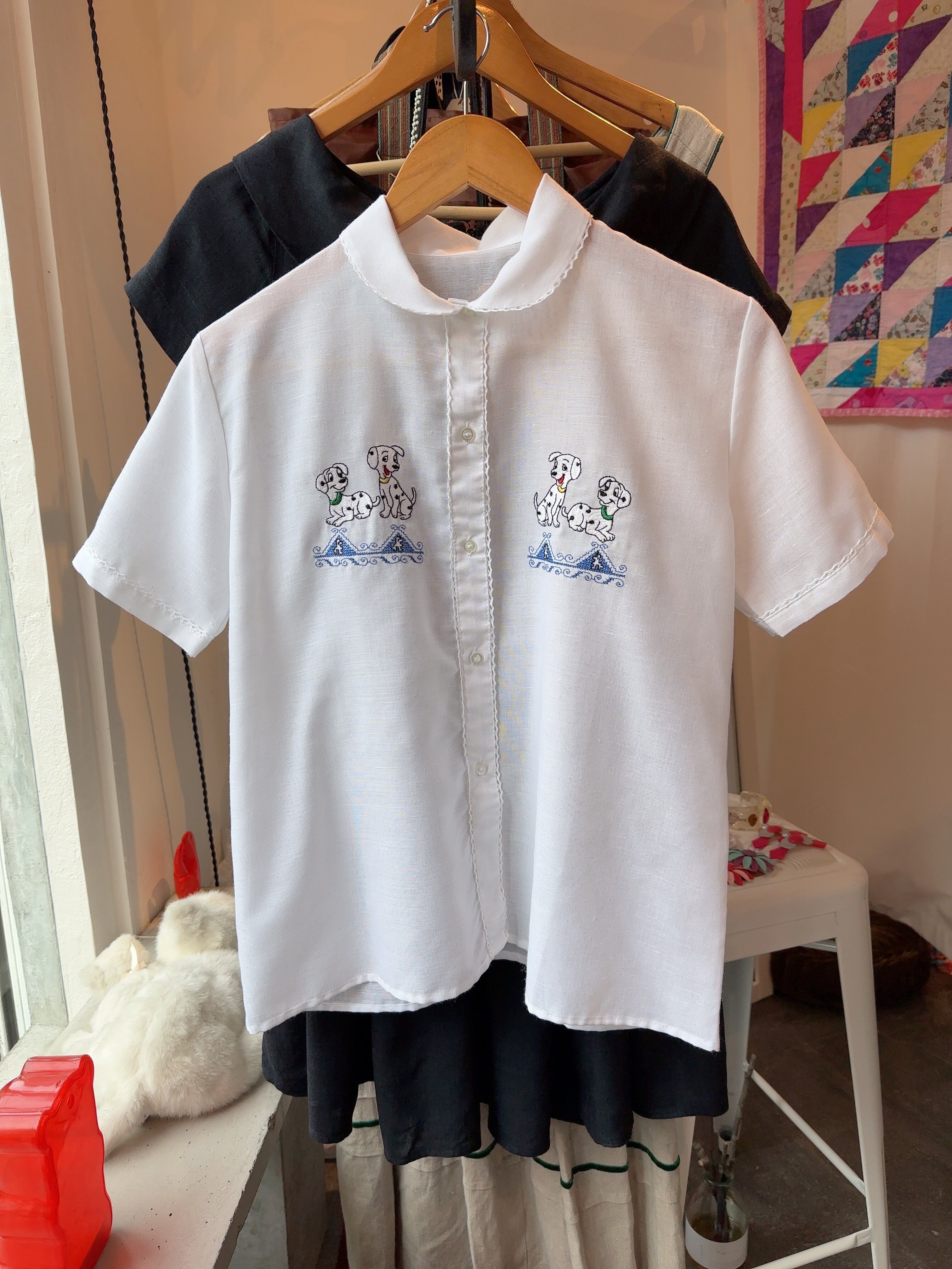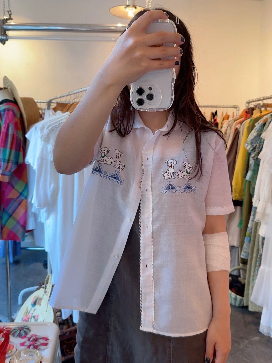 犬の刺繍が施されホワイトのガーゼシャツです。