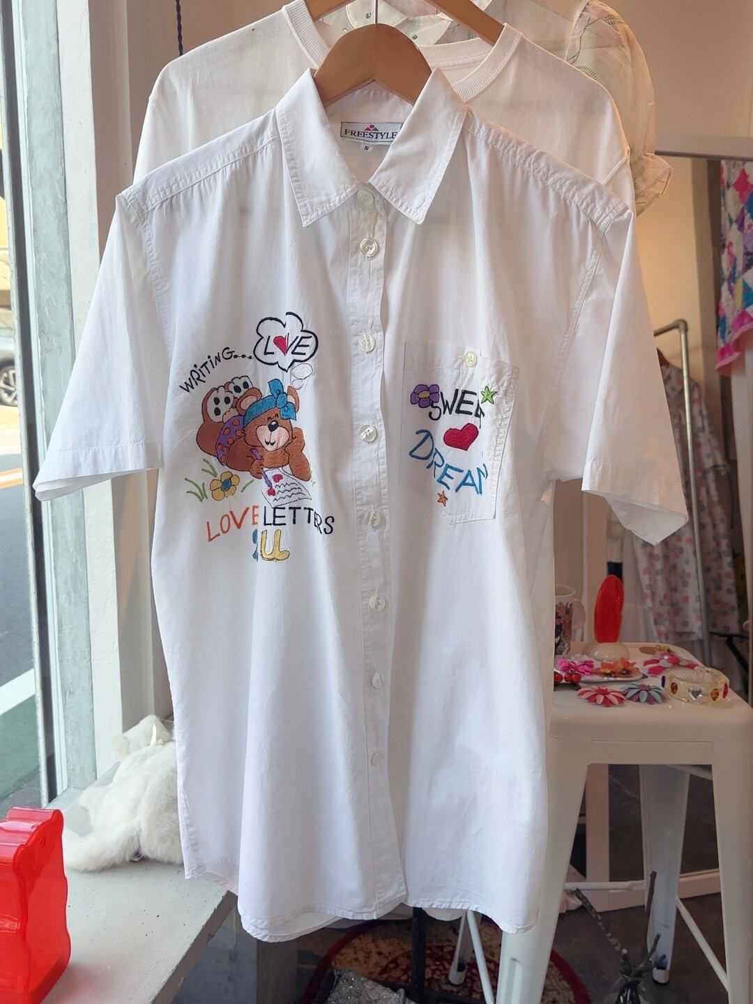 可愛らしいモチーフですが、メンズシャツとのバランスがとても素敵です。