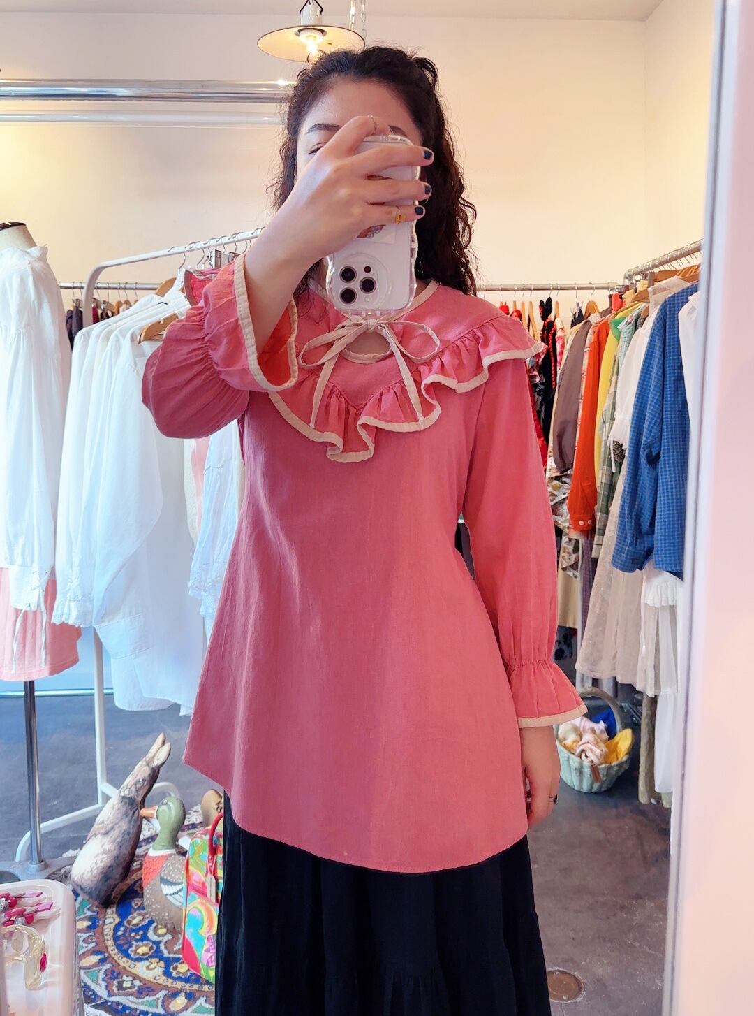 淡いピンクのラッフルブラウスです。