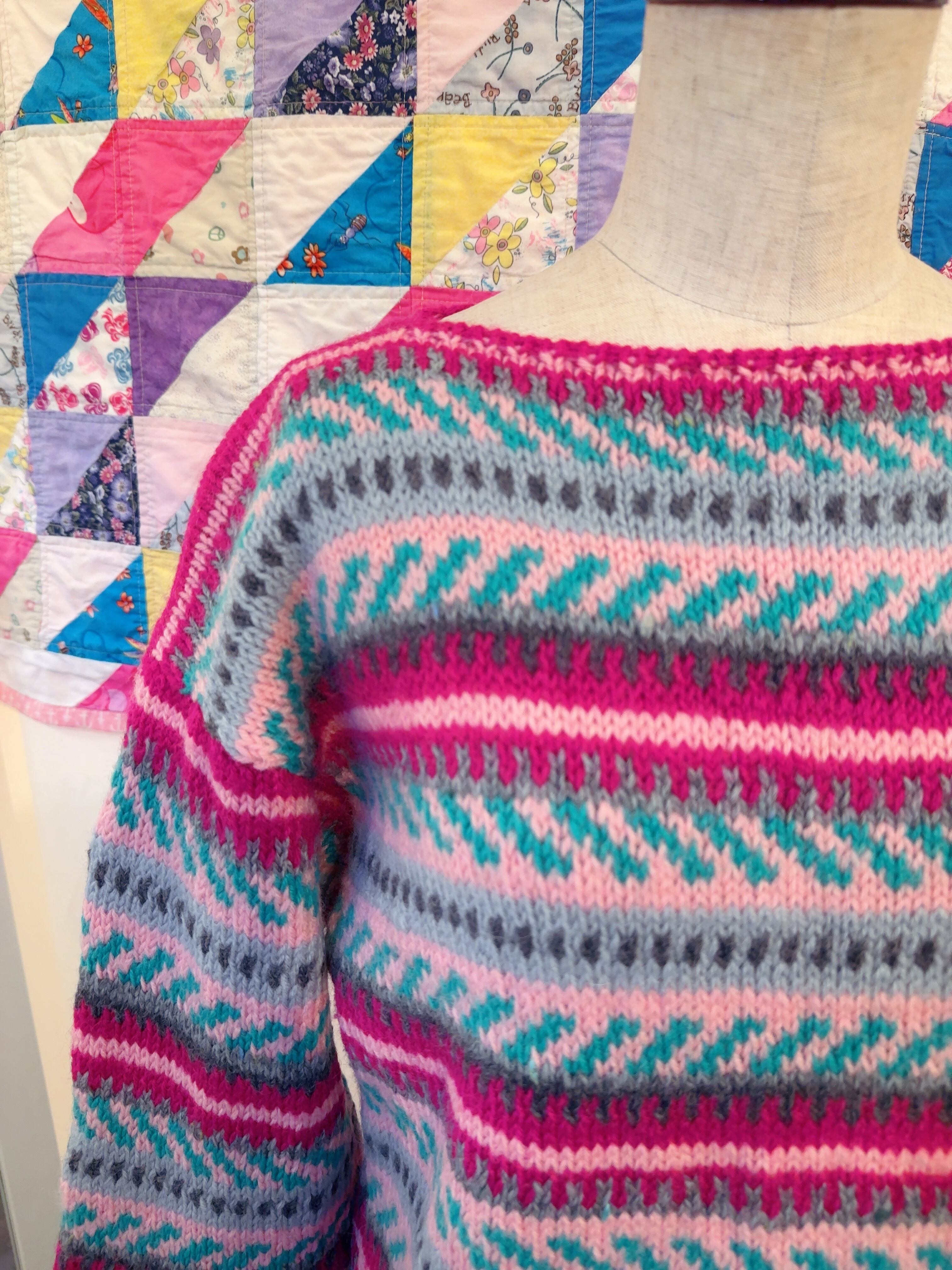 カラフルな色味ですが、ボートネックなのですっきりと子供っぽくなりすぎず着用いただけます。大きめのサイズ感で肩の落ち具合などシルエットも可愛いです。