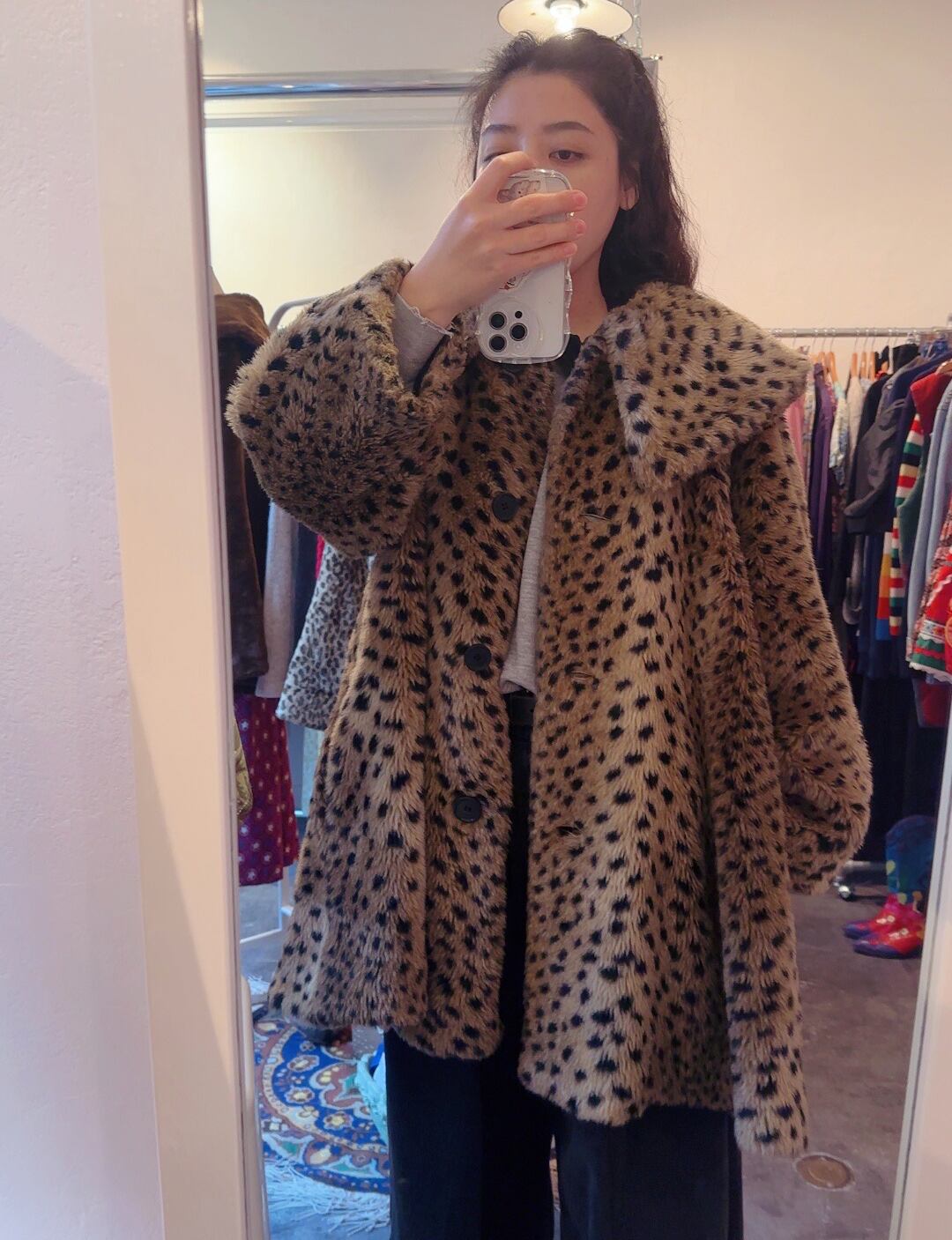 大きい襟、Aラインのシルエットがとても可愛いく、嫌な派手さがないレオパードの柄もgoodです。古いコート特有の重さもありません。