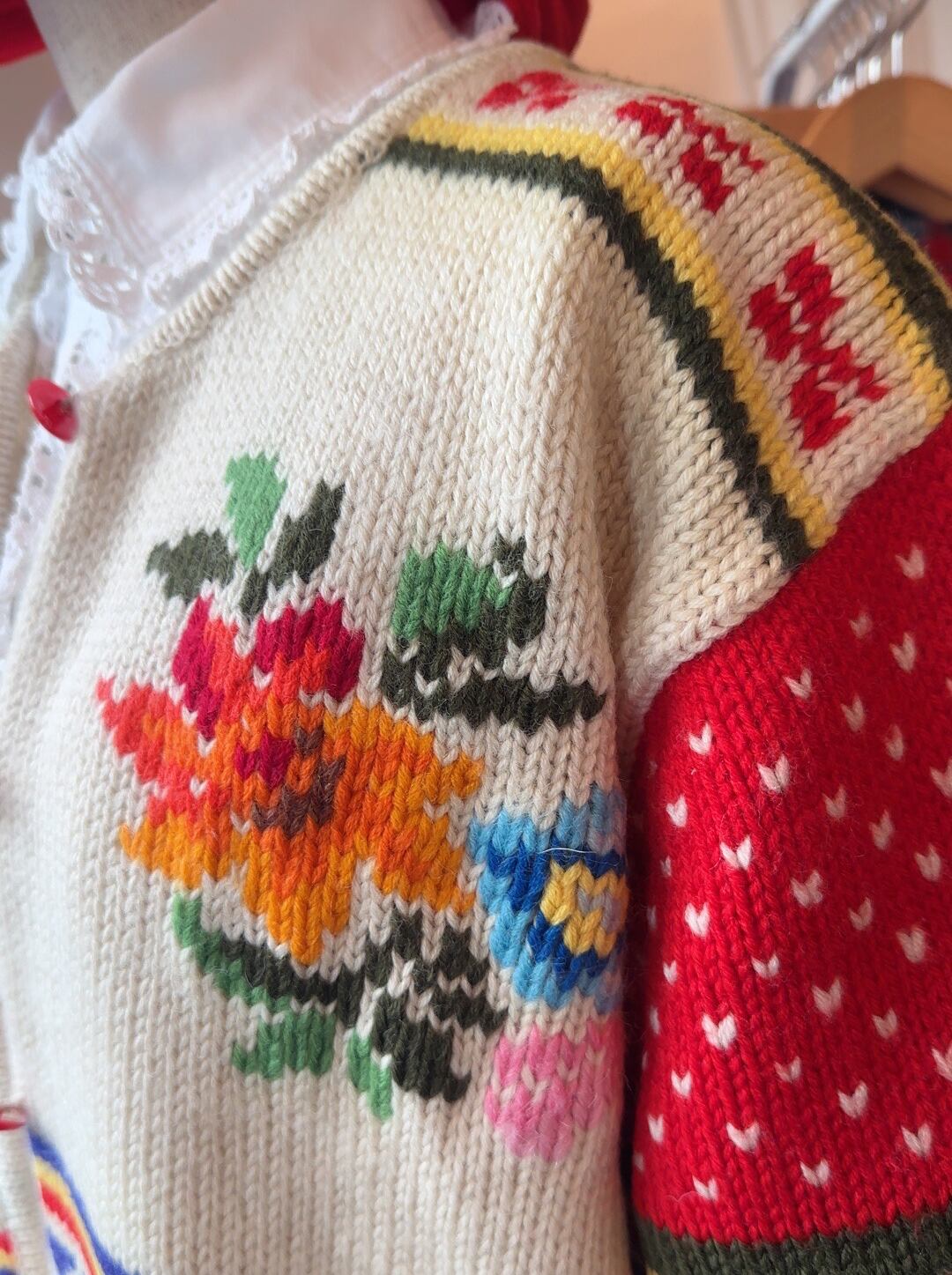 植物やフルーツやいろんなモチーフが編み込まれたニットカーディガンです。