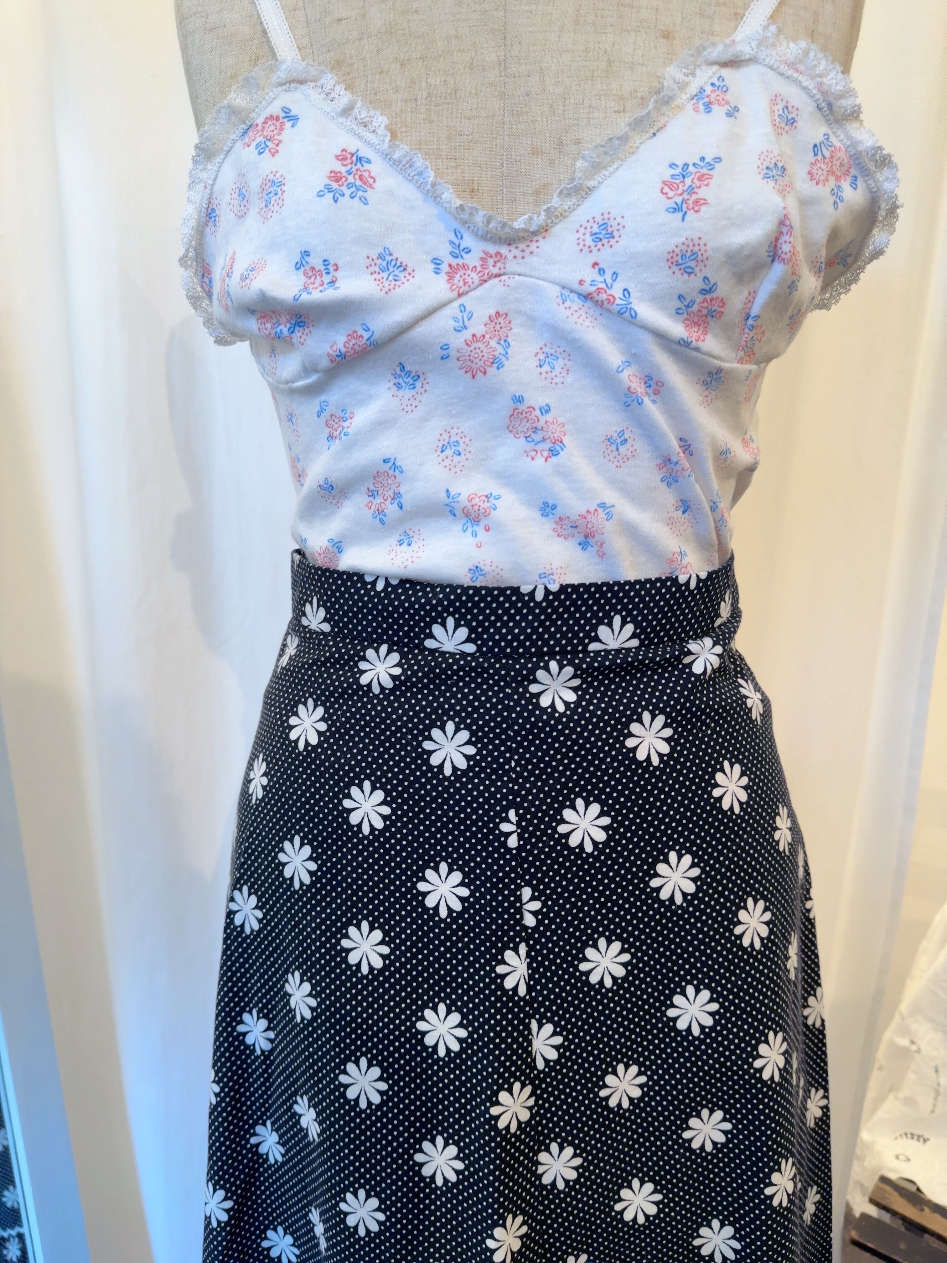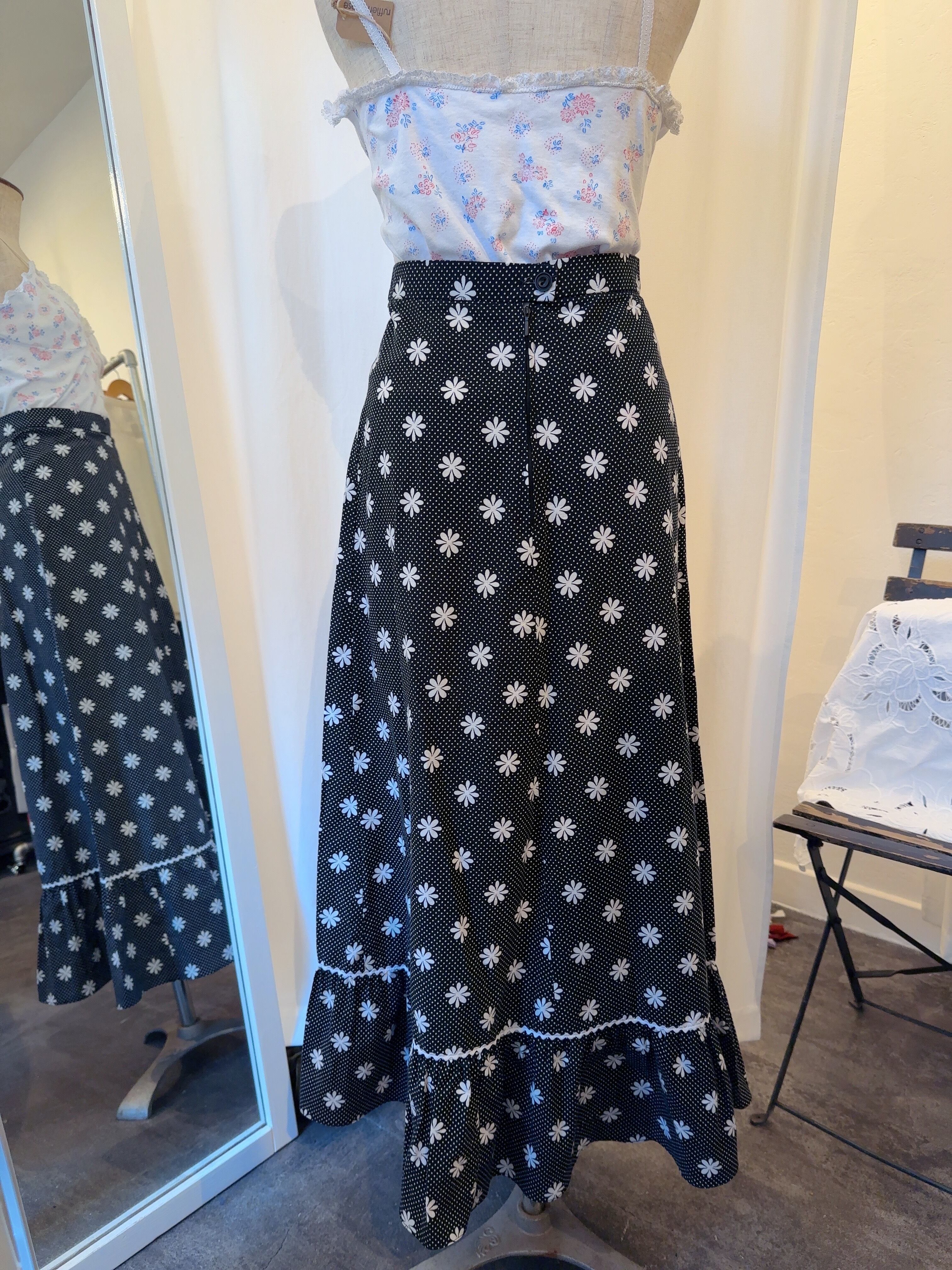 レトロなフラワーモチーフとドット柄がとても可愛いロングスカートです。