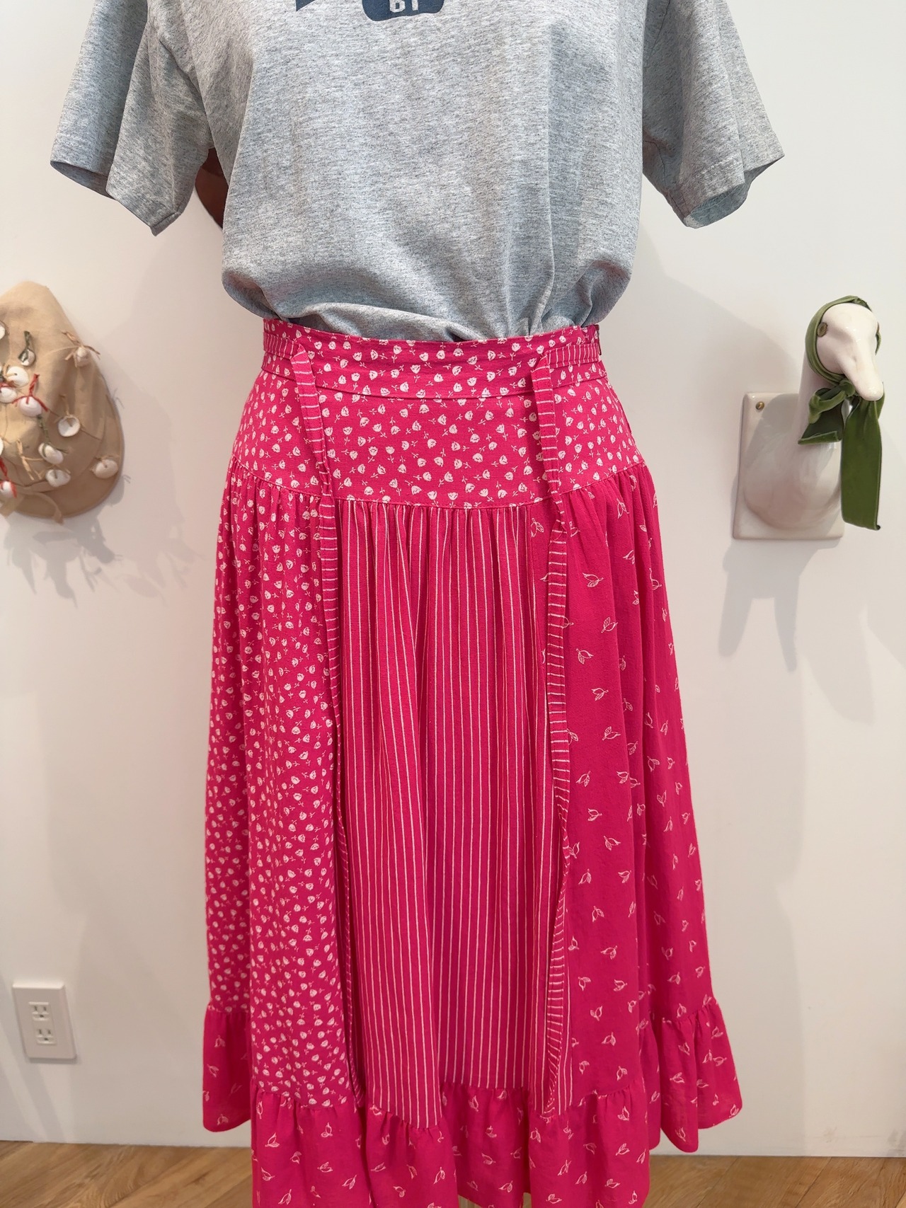 2種類の花柄とストライプ生地の切り替えがアクセントになっています。