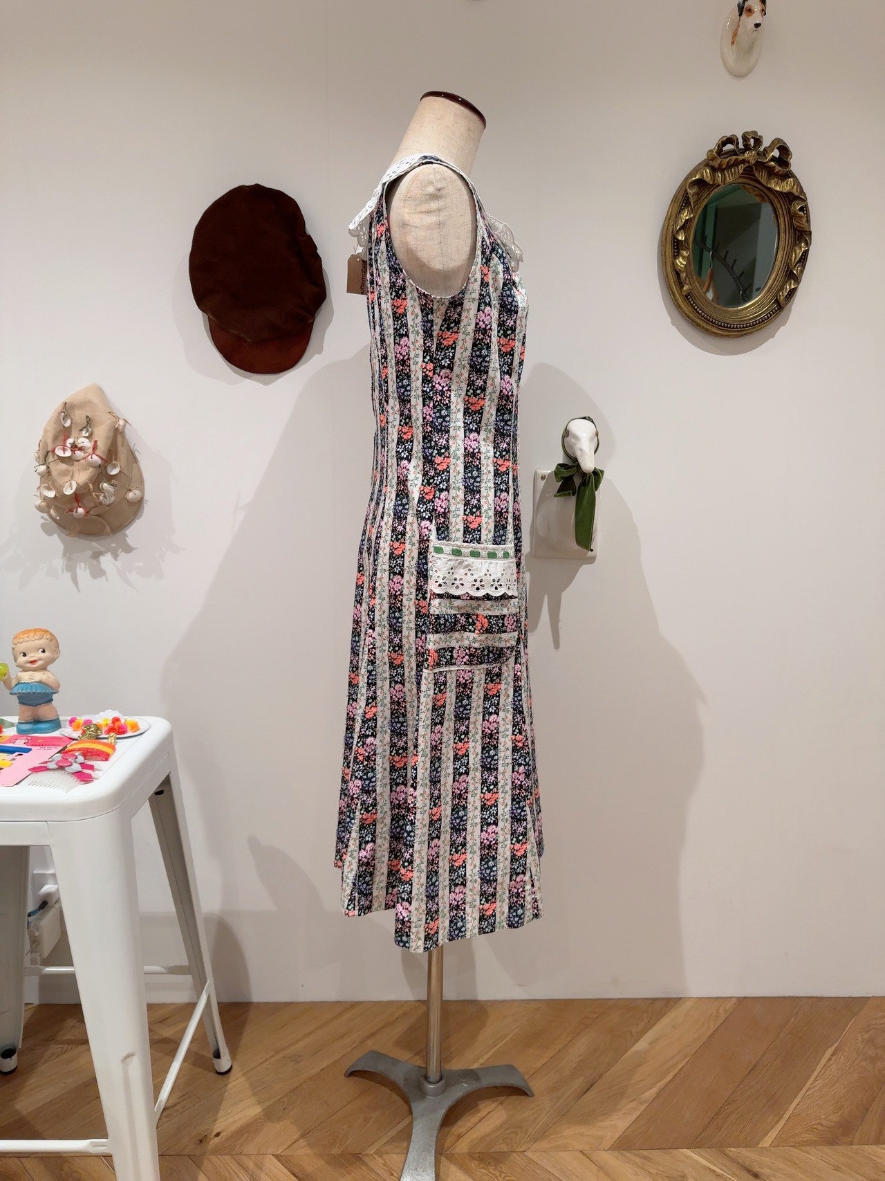 70年〜80年頃のハンドメイドのストライプとお花柄のノースリーブドレスです。レースとグリーンのコードがアクセントになっています。状態、とても良いです。