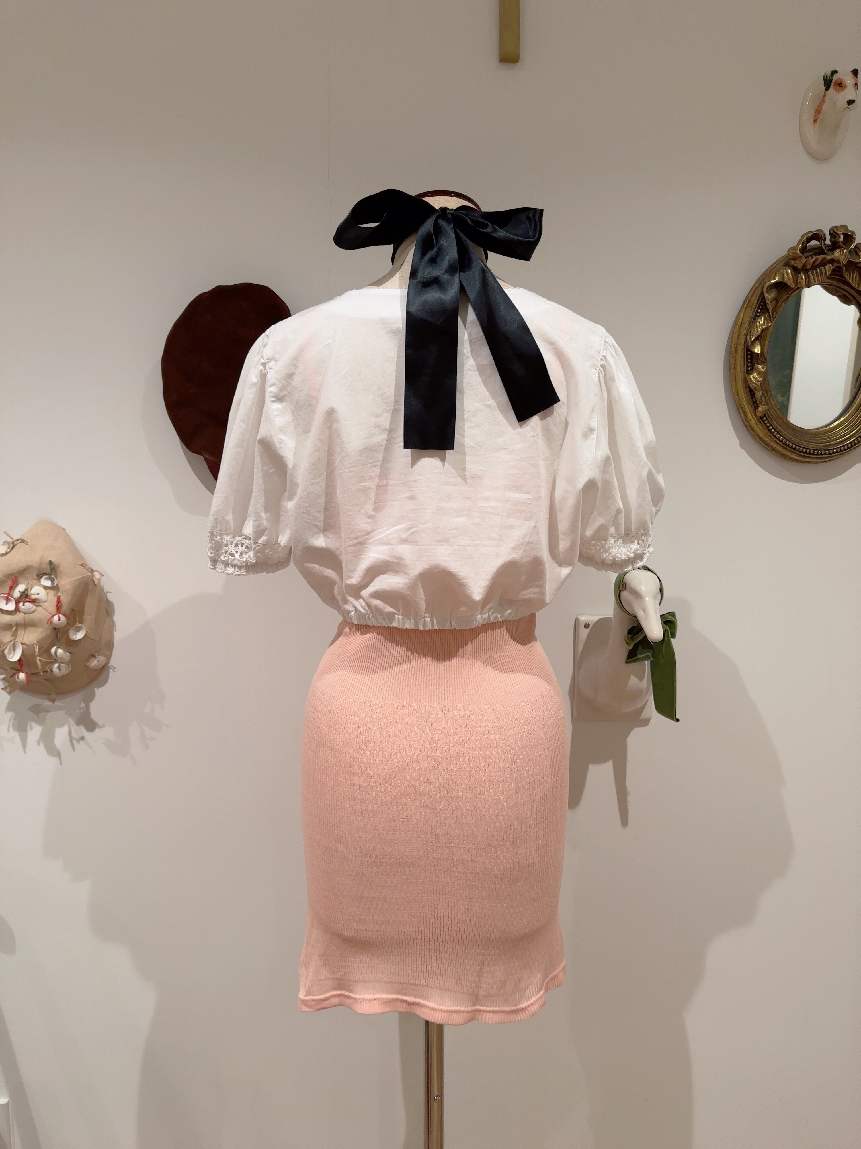 袖口と裾にゴムが入っています。バスト中心部分の長さが調整できます。