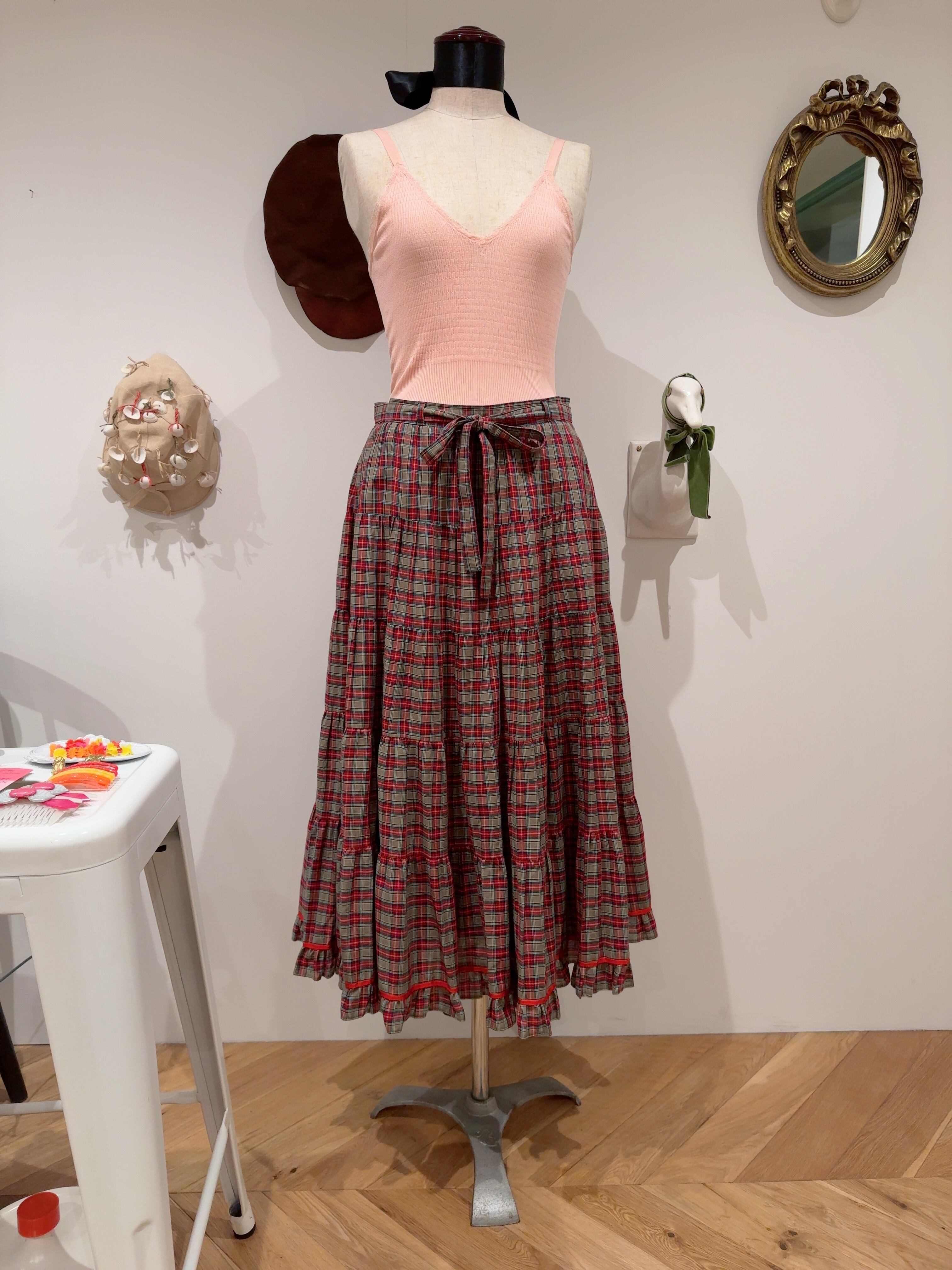 チェック柄のボリュームスカート。ウエストリボン付き。