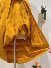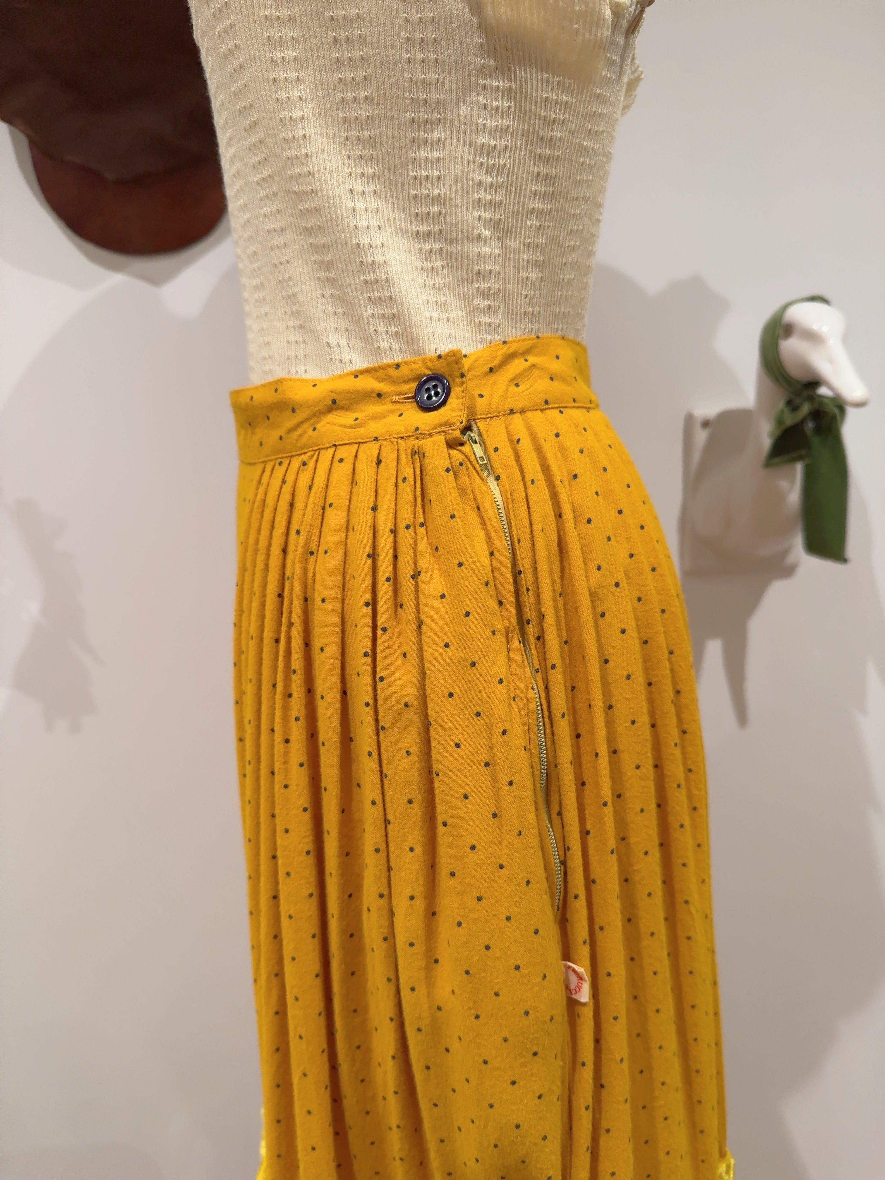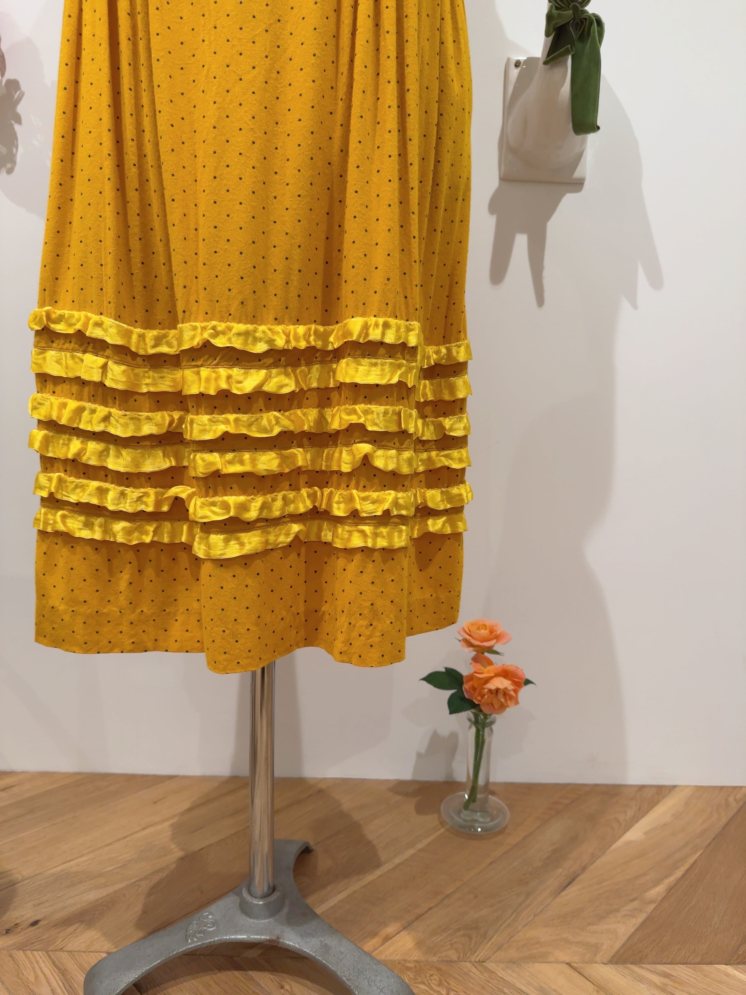 細かいドットはよく見るとネイビーカラー、裾に段に付いているフリルはサテンリボンのような素材感です。両サイドポケット付きなところも嬉しいポイントです。