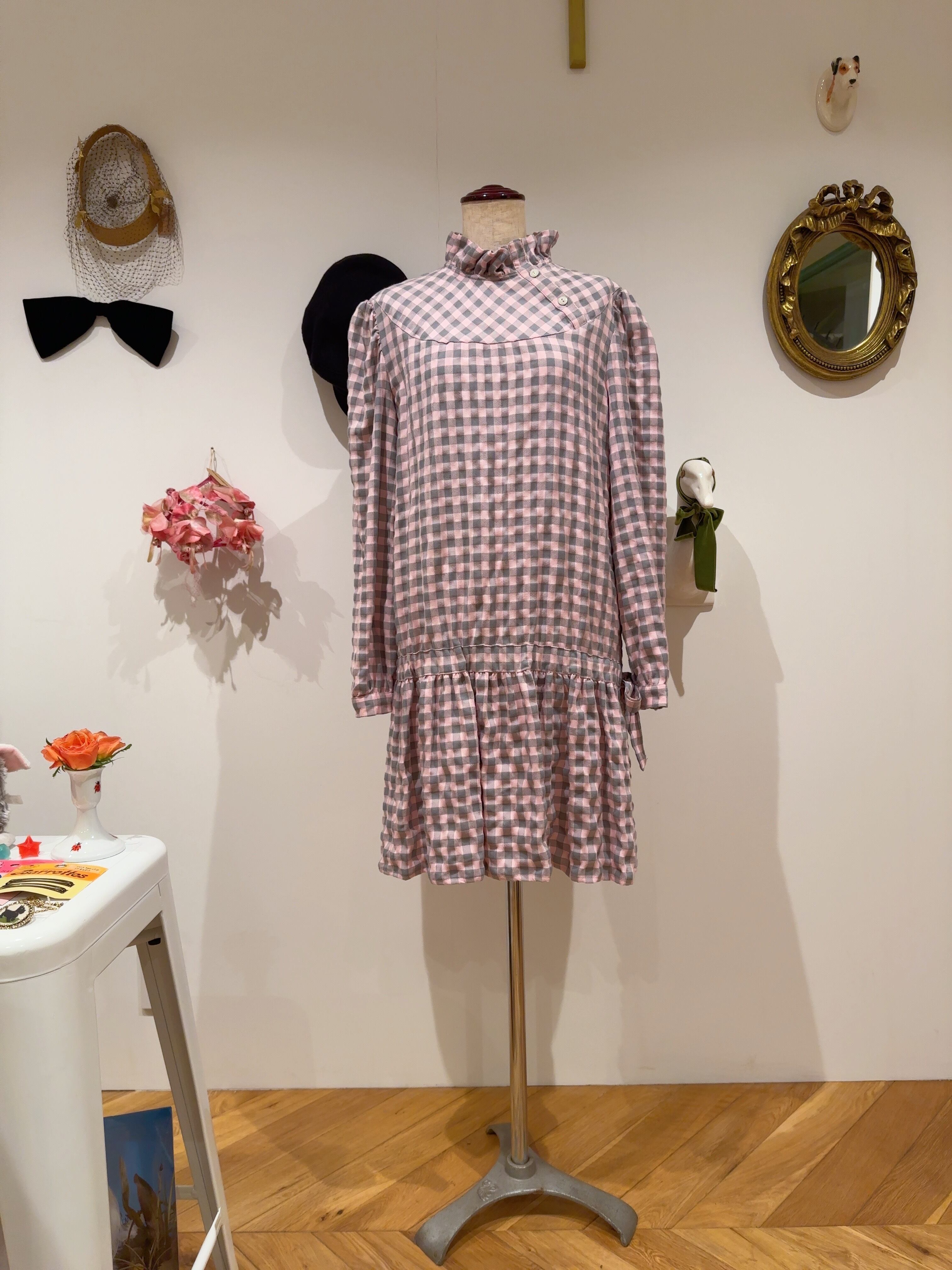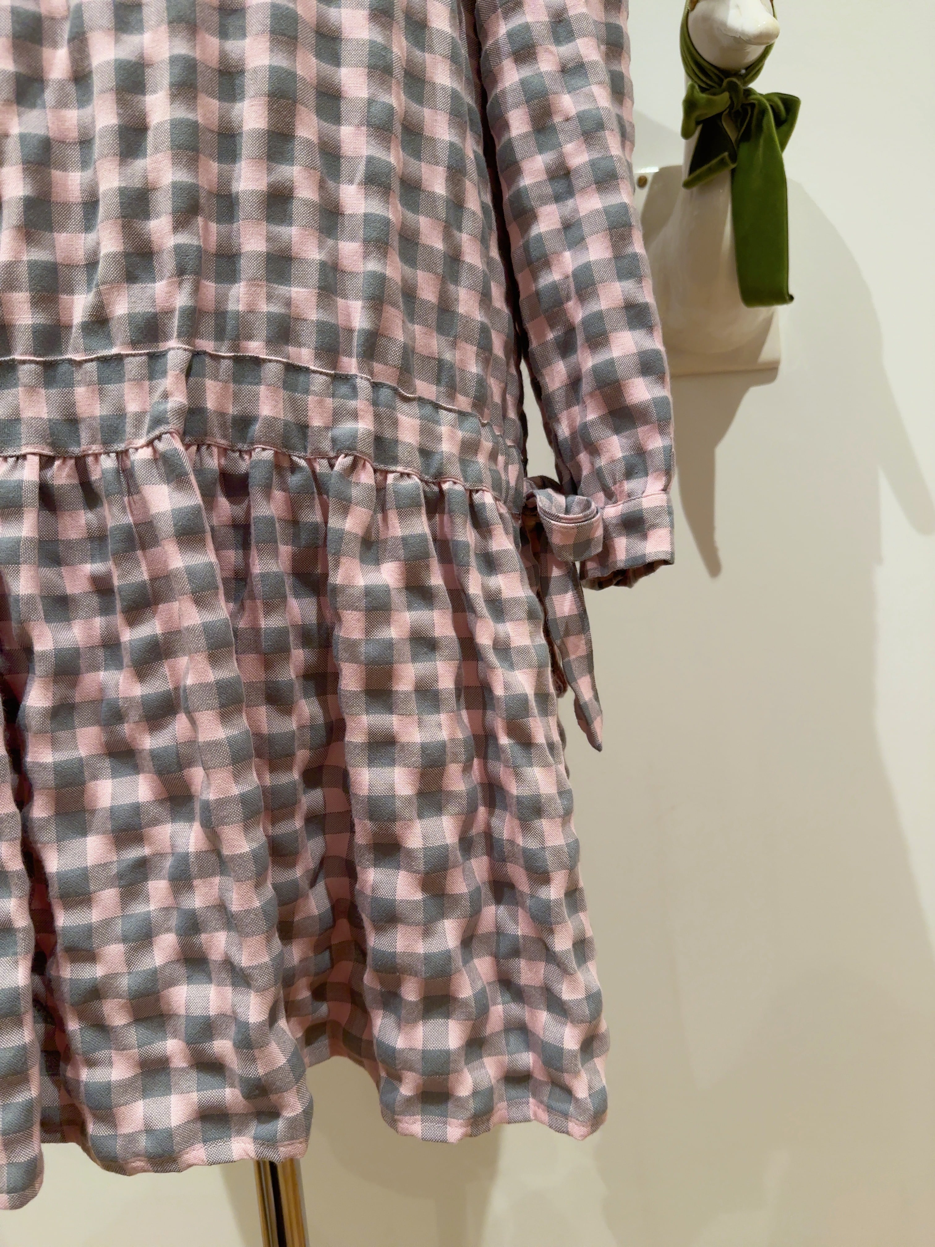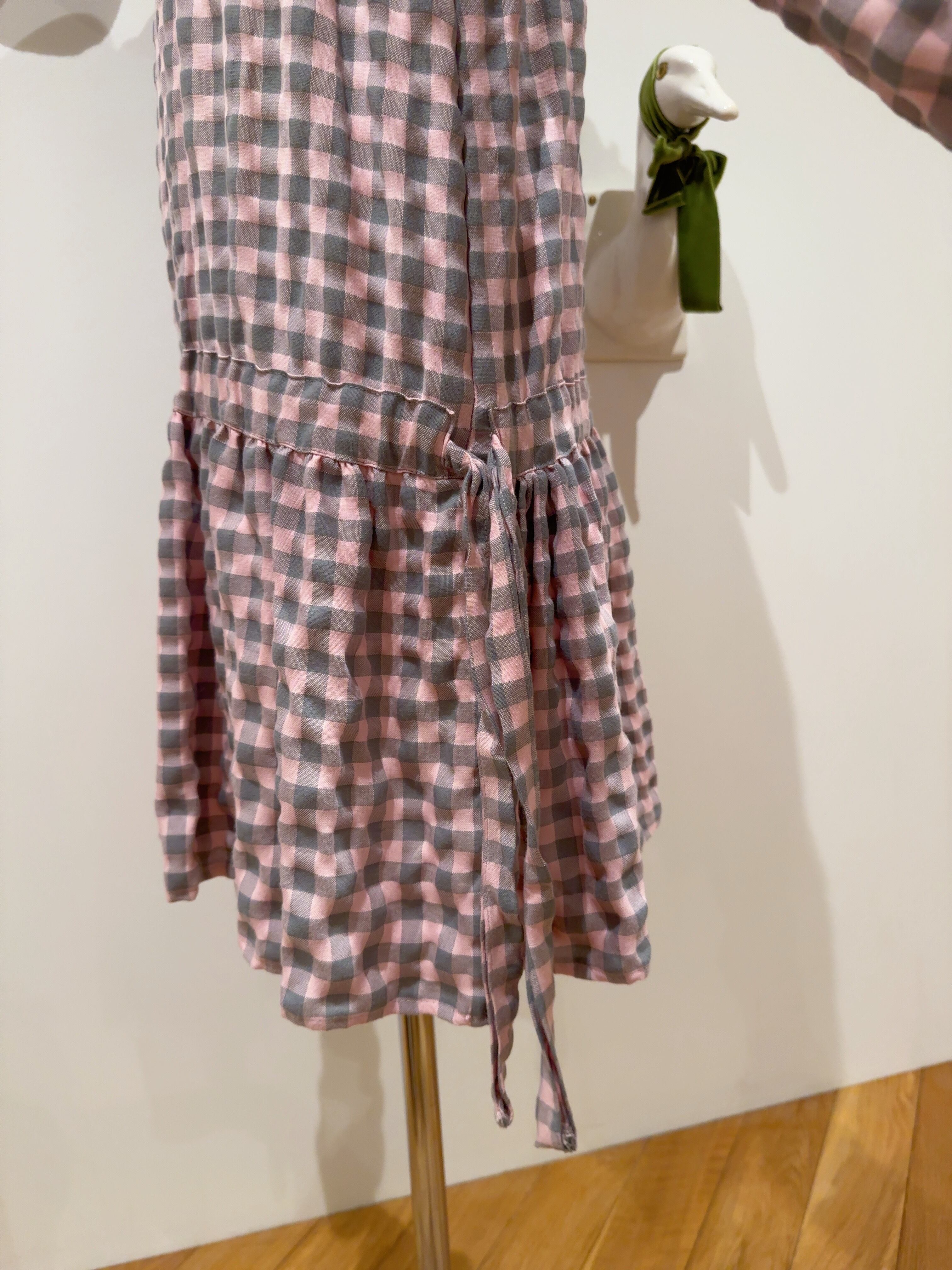 淡いピンクとグレーのブロックチェックのローウエストワンピースです。
