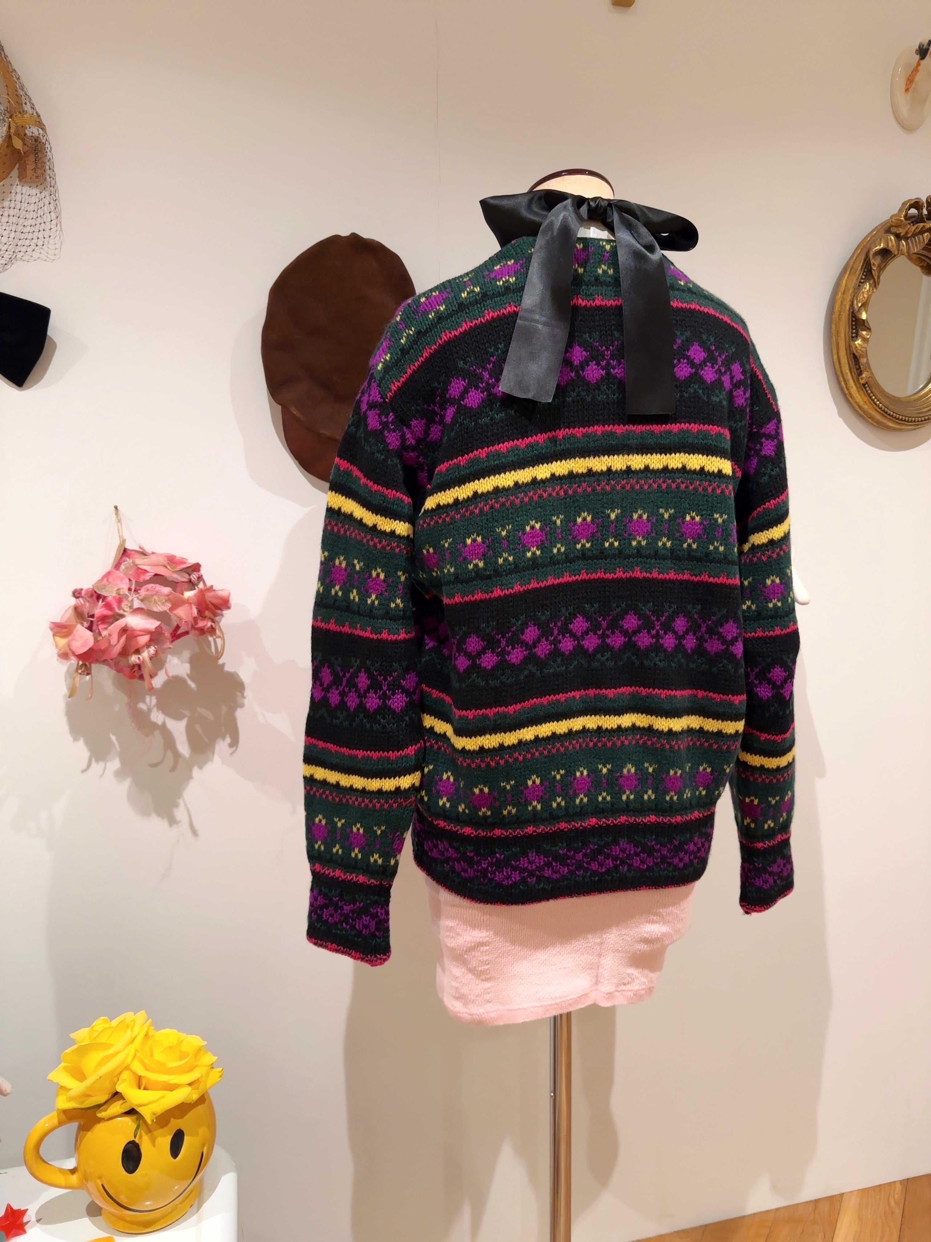 グリーンやピンクのパイピング、ストライプ柄やお花柄など色々な可愛い要素が詰まったシェットランドウールカーディガンです。