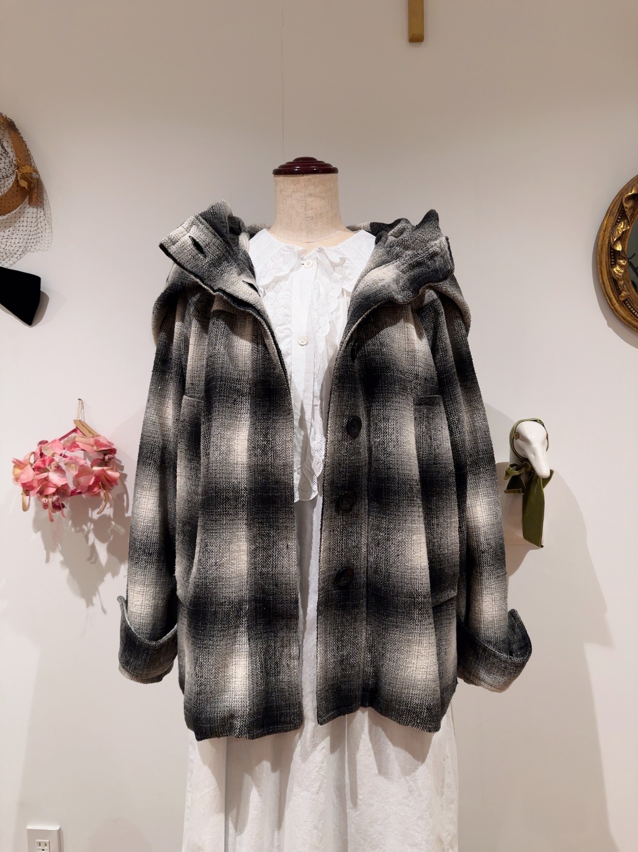フード部分が大きく、リボンのように留められます。