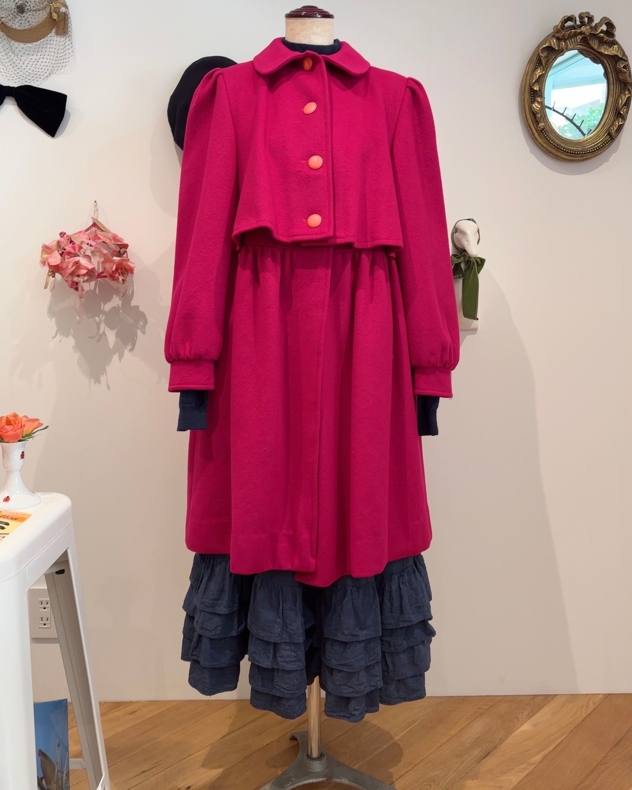 シルエットや丸襟、ぽてっとしたボタンなど可愛い要素がたくさん詰まっています。