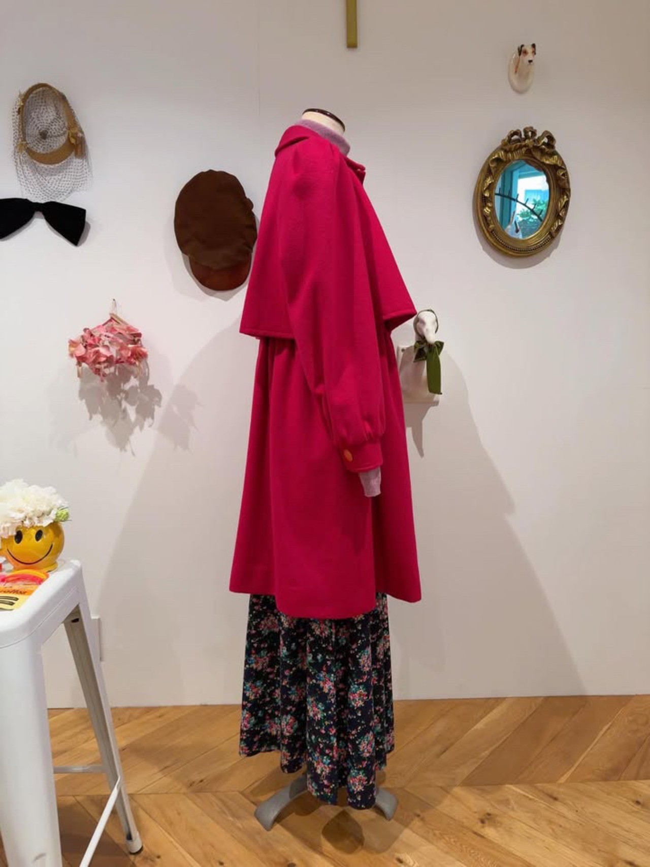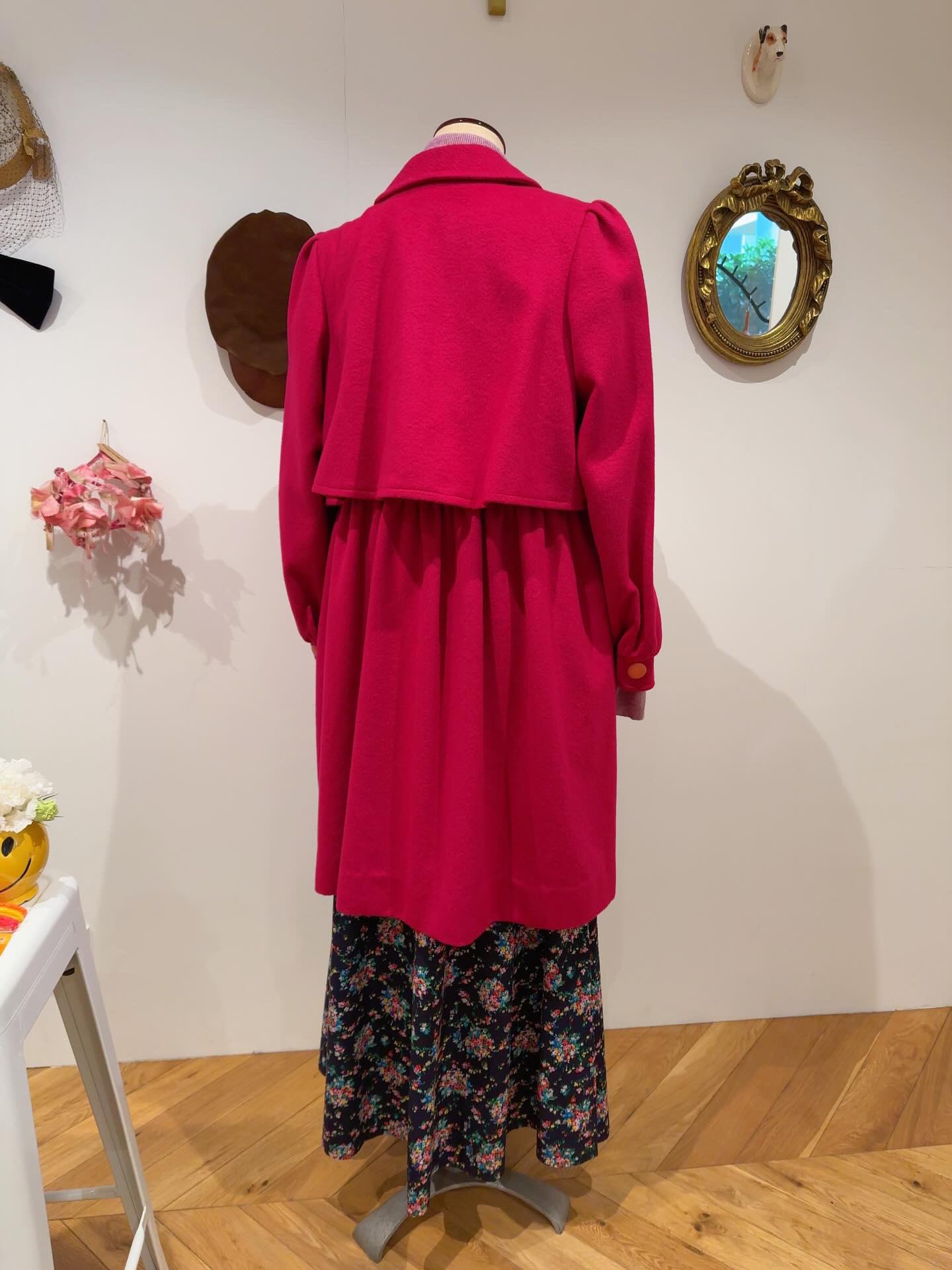 落ち着いたラズベリーカラーとカシミヤがベースになっているので素材も上質感もあり、可愛さと上質さのバランスが素敵です。後ろから見ても可愛さが詰まっています。